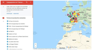 Une cartographie bien utile des fermes aquaponique (hors cadre « loisir/ systèmes pour particuliers) a été créée par APIVA (Aquaponie, Innovation Végétale et Aquaculture).