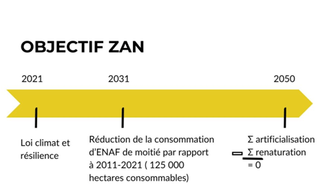 Avec la loi résilience promulguée le 22 août 2021, la bétonisation des terres est encadrée. Le rythme d’artificialisation devra être divisé par deux d’ici 2030. Le zéro artificialisation nette (ZAN) devra être atteint d’ici 2050. Cet objectif sera décliné dans les territoires. Un principe général d’interdiction de création de nouveaux centres commerciaux qui entraîneraient une artificialisation des sols est posé (Source). La nécessité de la loi est bien comprise par les élu.es. Cependant cela implique une réflexion de fond sur les nouvelles formes d’aménagement du territoire, les trajets entre l’habitat et les lieux de travail(2). C’est tout le « comment on construit » qui est réinterrogé et remis en question. Et sur le terrain, ce n’est pas simple !