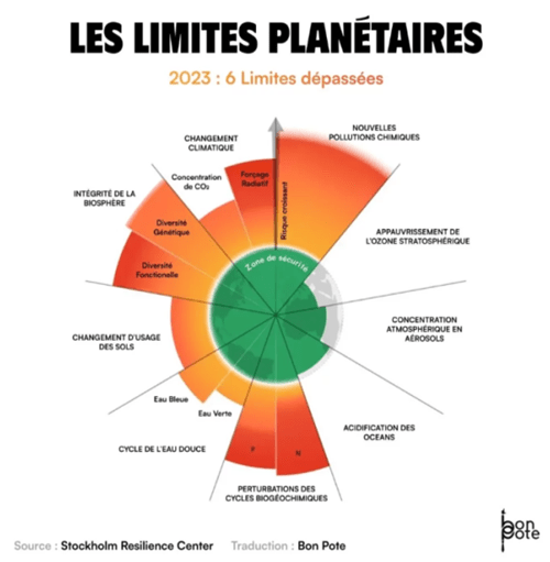 Limites planétaires : 3 limites sont franchies selon une première étude en 2009. 4 sont dépassées selon l’étude en 2015. puis 6 selon les plus récents travaux en 2023. Voir les détails ICI