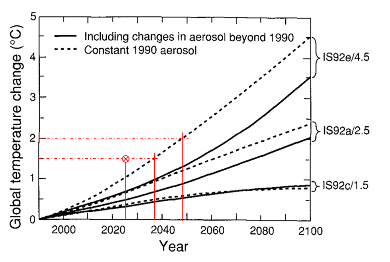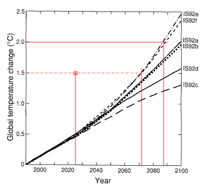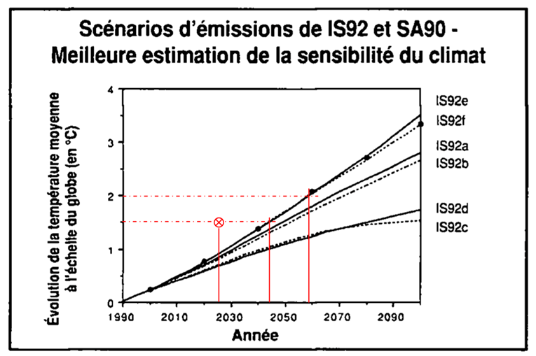 Commençons par le premier rapport, publié en 1990. Selon le scénario le plus défavorable, intitulé à l’époque le IS92e, le dépassement des +1,5°C est envisagé vers 2045 et l’atteinte des +2°C un peu avant 2060 (figure 1). Alors qu’aujourd’hui, le +1,5°C est atteint