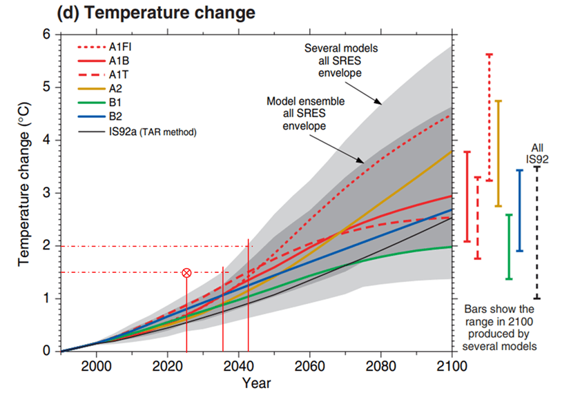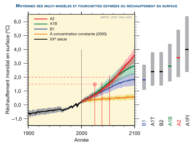 En 2007 (quatrième rapport), la courbe de projection la plus inquiétante (figure 5) conduit à une atteinte des +1.5°C un peu avant 2040 et les + 2°C sont franchis entre 2050 et 2060. L’amélioration permanente des modèles conduit à redonner une « marge de manœuvre » légèrement plus importante aux politiques d’atténuation.