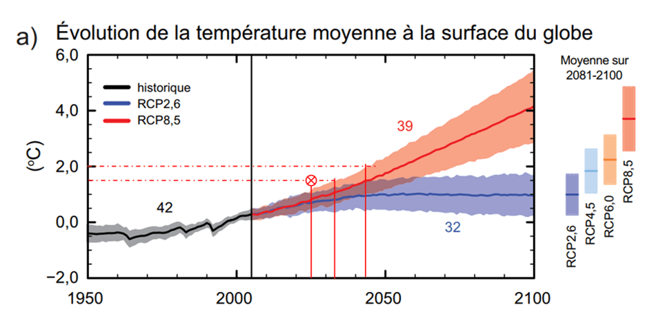Le cinquième rapport, datant de 2014, va envisager un scénario bien plus grave que prévu précédemment (figure 6). Les plus sinistres projections (du RCP8.5 mais aussi du RCP2.6) envisagent un dépassement des + 1,5°C un peu après 2030, avant 2035. Les + 2°C sont franchis entre 2040 et 2050 (RCP8.5).