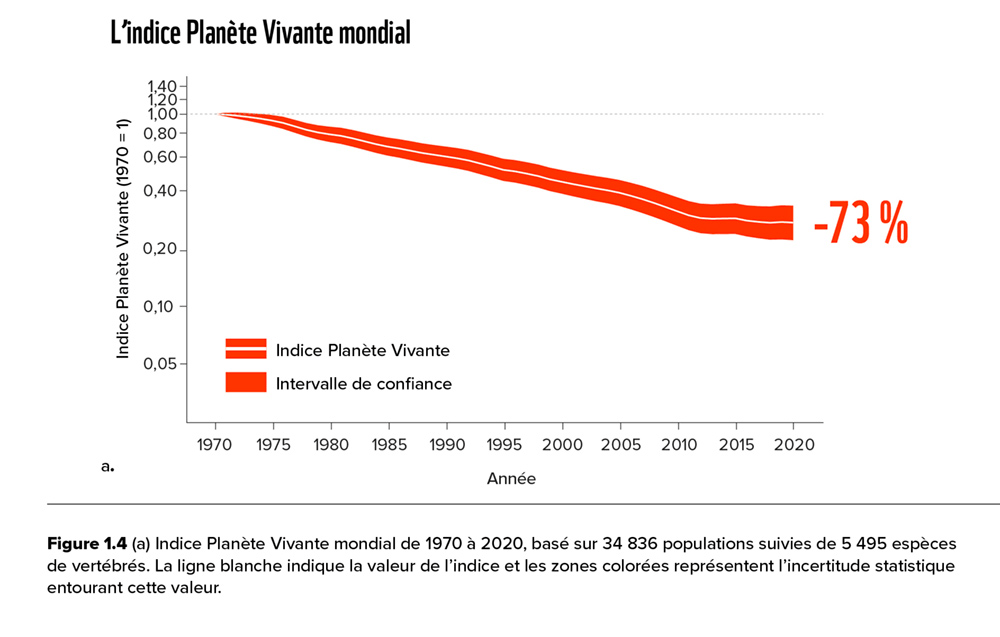 Le Rapport Planète Vivante 2024 du WWF révélait une diminution de 73 % de la taille moyenne des populations de vertébrés sauvages entre 1970 et 2020 (source). Les espèces d’eau douce étant particulièrement touchées, avec une baisse de 85 % (source).