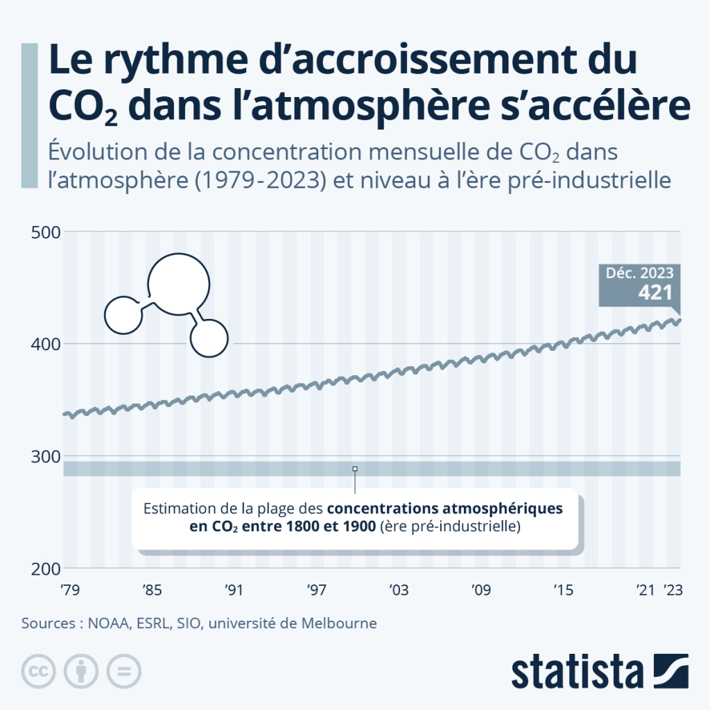 En termes d’équivalents CO2, l’atmosphère en 2019 contenait 500 ppm, dont 410 de CO2 seul. Le reste provient d’autres gaz.