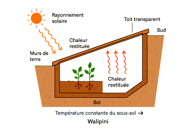 Le mot walipini, issu de la langue aymara, signifie littéralement « lieu chaud » ou « abri du soleil ». Concrètement, c’est une serre semi-enterrée, creusée sur environ deux mètres de profondeur, dont le toit transparent, incliné vers le sud, capte les rayons solaires sous un angle optimal. Les parois de terre, épaisses et denses, emmagasinent la chaleur durant la journée pour la restituer la nuit, tandis que le sol, dont la température reste stable tout au long de l’année (autour de 10 à 15 °C selon les régions), agit comme un immense tampon thermique. Cette inertie du sol constitue la clé du dispositif : elle limite les pertes de chaleur et maintient à l’intérieur un climat tempéré, même en plein hiver.