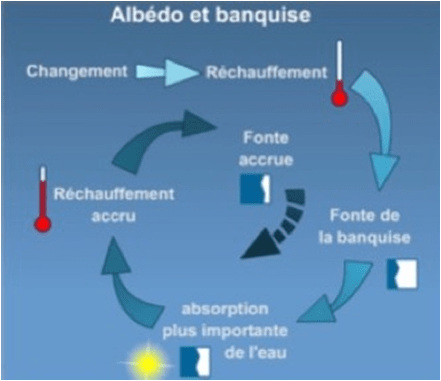 1) Effondrement de la cryosphère en Arctique : La réduction de la glace de mer arctique en été. Ce qui génère une augmentation de l’absorption de chaleur par l’océan (albédo réduit), accélérant le réchauffement.
