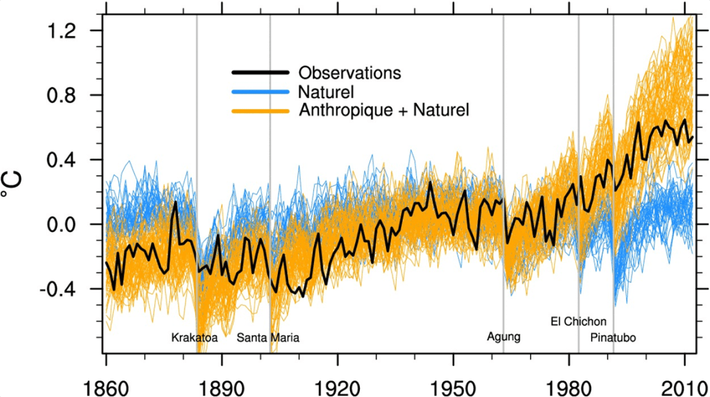 Evolution de l’anomalie de température moyenne globale sur la période 1860-2012 dans les observations (en noir), et dans les simulations CMIP5 utilisées dans le rapport du GIEC (2013) prenant en compte soit l’ensemble des facteurs connus (anthropiques et naturels, orange), soit uniquement les facteurs naturels (bleu). Les principales éruptions volcaniques sont indiquées par les barres verticales. Source : Méteo France.