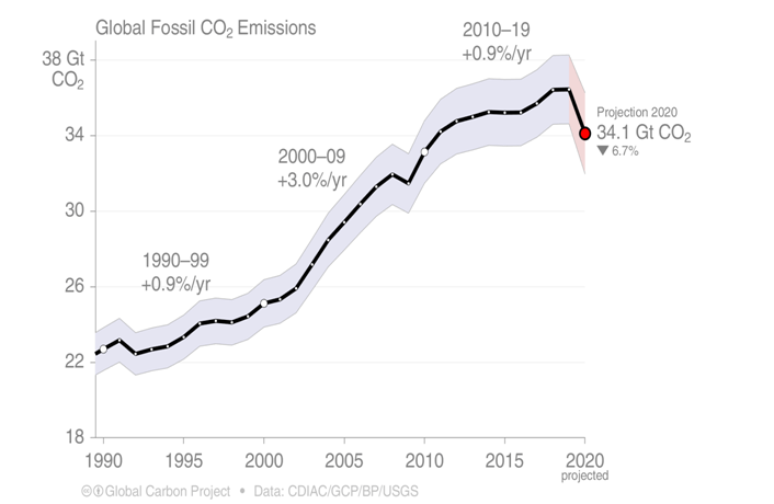 Actuellement, le monde émet presque 40 Gigatonnes de Co2 par année (2018). C’était 2 gigatonnes en 1900. C’est le principal gaz à effet de serre (en quantité) produit par l’activité humaine : 74 % du total (tous modes d’émissions réunis).