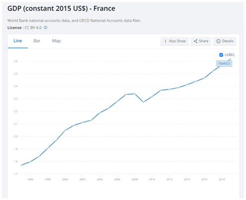 Dans le même temps, le PIB — qui mesure la somme des valeurs ajoutées — a nettement augmenté. Les données de la Banque mondiale montrent qu’il est passé d’environ 1 734 milliards d’euros constants en 1995 à 2 620 milliards d’euros en 2019 (en euros 2015).