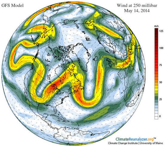 Durant les événements extrêmes, ses coudes se sont aventurés loin au nord et au sud, et ils ont comme calé – ils ont stoppé leur progression vers l’est. Or plus ces sinuosités sont larges, plus les conditions climatiques s’aggravent sous les pics et les creux du S couché.