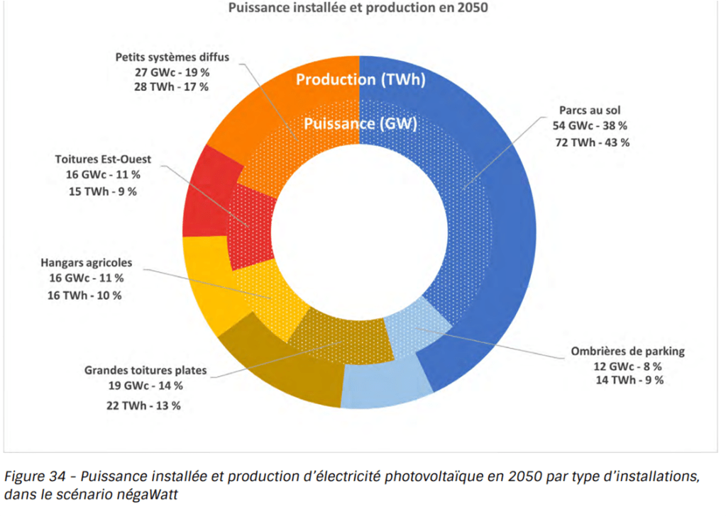 Le rapport Négawatt vise une puissance totale installée de 143 GW en 2050 (multiplication par 13 de la puissance installée actuelle). Les installations se font sous plusieurs formes : parc au sol, ombrières, grandes toitures plates, hangars agricoles, toitures, petits systèmes…