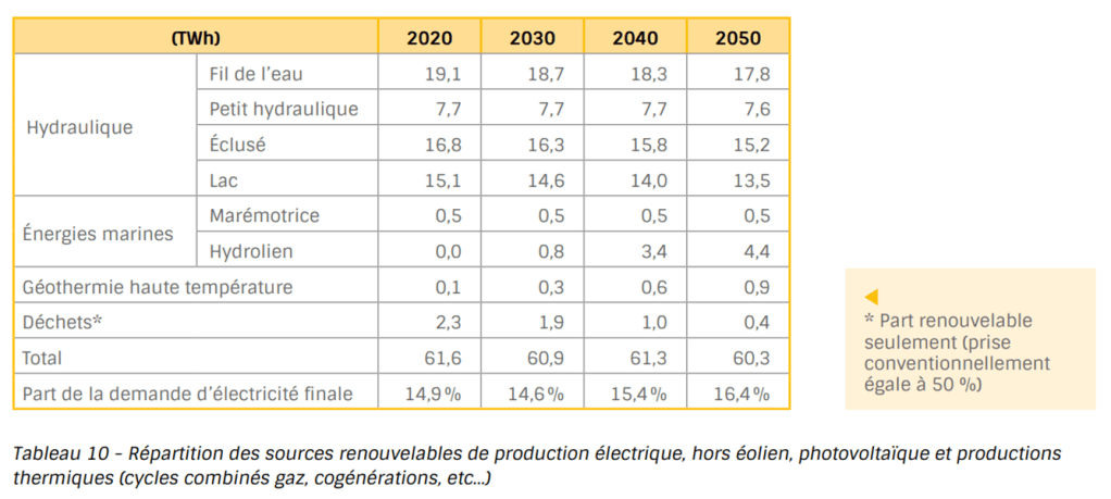 En complément des sources éolienne et solaire photovoltaïque, d’autres filières apportent un complément. Certaines permettent un pilotage de la production (hydraulique éclusée et lac, incinération de déchets), contrairement aux deux précédentes, et représentent environ la moitié des apports de ces filières. L’hydroélectricité est réduite en raison de l’impact du réchauffement climatique. Sur la géothermie, par prudence, un déploiement très modéré est retenu.