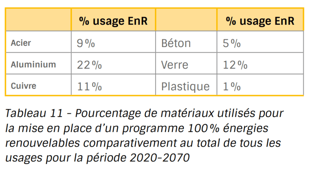 En résumé, dans le scénario de Négawatt, il s’avère que la part des matériaux dans une perspective d’un mix 100 % renouvelable demeure très faible.