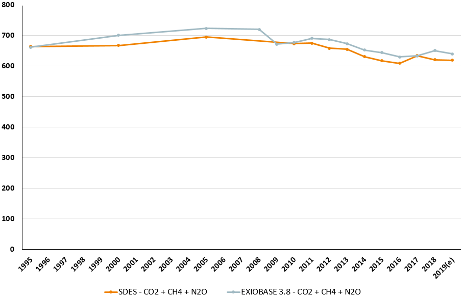 Un graphique, publié par le ministères de la Transition Ecologique et de la cohésion des territoires donne à voir une comparaison entre les résultats du SDES et résultats issus du modèle « Exiobase »- (CO2, CH4 et N2O). La période calculée va de 1995 à 2018 (avec une année 2019 provisoirement estimée).