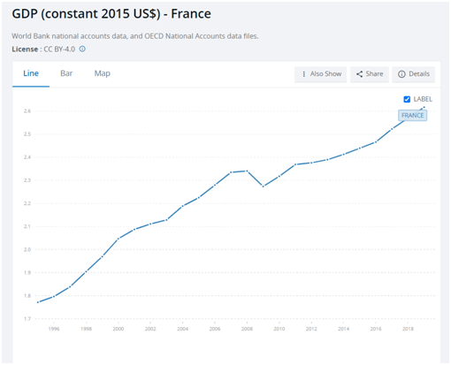 Dans le même temps, le « PIB » qui mesure la somme de toutes les valeurs ajoutées, a augmenter. Dans le graphique ci-dessous ((World Bank Open Data), nous pouvons constater qu’il est passé de quelques 1 734 milliards d’euros constants en 1995 à 2 620 milliards d’euros en 2019 (en euros 2015).