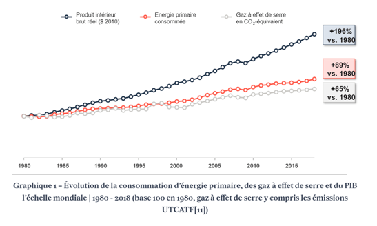 Il y a donc bien un relatif découplage. Mais d’une part, cela ne vaut que pour la France (le découplage relatif est bien plus modeste à l’échelle mondiale, voir graphique suivant) et d’autre part, un tel découplage n’est, de toutes manières, pas assez conséquent pour permettre d’atteindre l’objectif d’une réelle neutralité carbone en 2050. Continuer sur la même voie d’accumulation de biens et de services ne peut en aucun cas nous permettre de parvenir à un « deux tonnes » d’émissions, en moyenne, par personne.