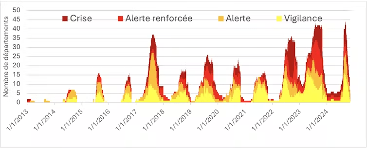 Globalement, 2024 devrait être la septième année la plus pluvieuse depuis 1959, selon Météo-France, avec plus de 1 075 mm de précipitations en moyenne sur le pays. La Corse est la seule région à connaître un déficit de pluies sur l’année.