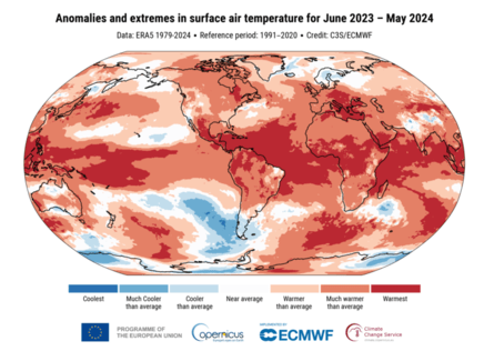 Le rapport de l’OMM confirme que 2023 a été l’année la plus chaude jamais enregistrée, avec une température moyenne à la surface du globe de 1,45 °C (marge d’incertitude de ± 0,12 °C) au-dessus du niveau de référence de l’ère préindustrielle. Il s’agit de la décennie la plus chaude jamais observée.